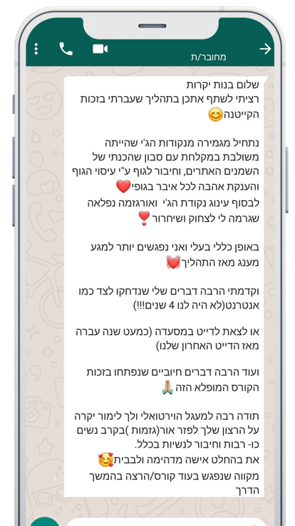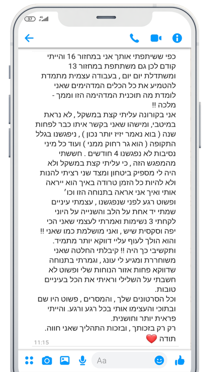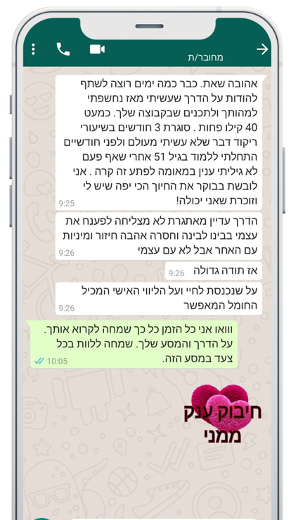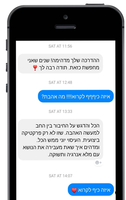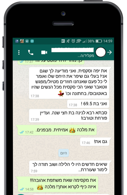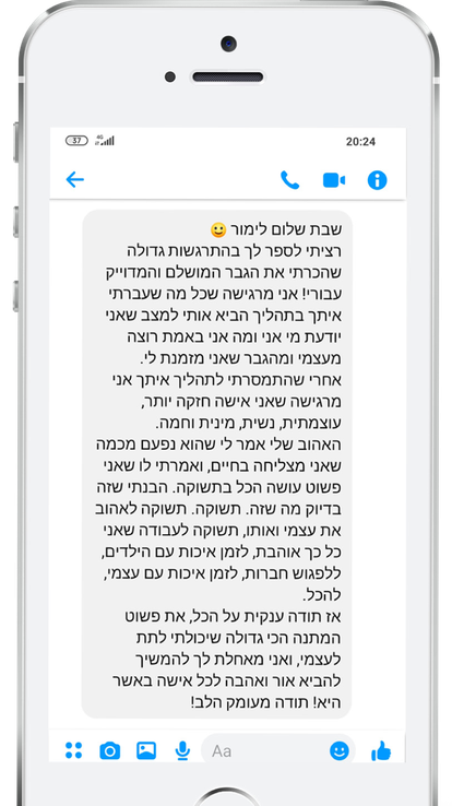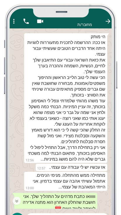 "...אני מרגישה שכל מה שעברתי איתך בתהליך הביא אותי למצב שאני יודעת מי אני ומה אני באמת רוצה מעצמי ומהגבר שאני מזמנת לי.