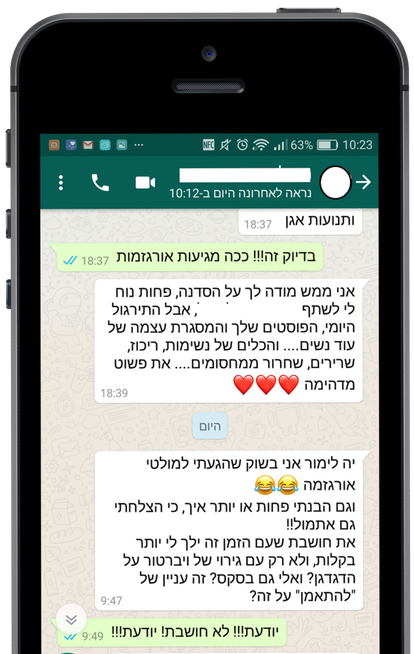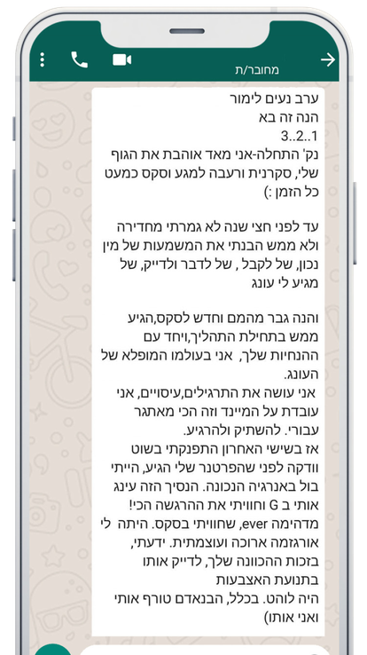 ...את כזו השראה עבורי עם התיאבון שלך לחיים\ הנשיות, השמחה וההכרה בערך העצמי שלך... הבנתי כמה משקל ולחץ אני שמה על גבר כי אני מצפה שהוא יענג אותי כמו שאני רוצה, כשאני בעצמי לא לוקחת אחריות על העונג שלי....
