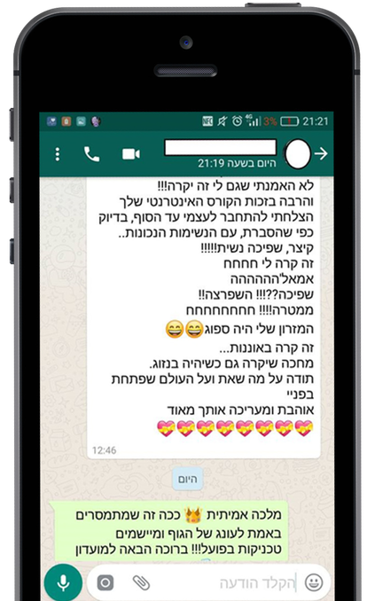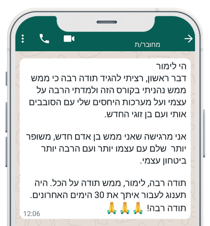...ממש ממש נהניתי בקורס הזה ולמדתי הרבה על עצמי ועל מערכות היחסים שלי עם הסובבים אותי ועם בן זוגי החדש.